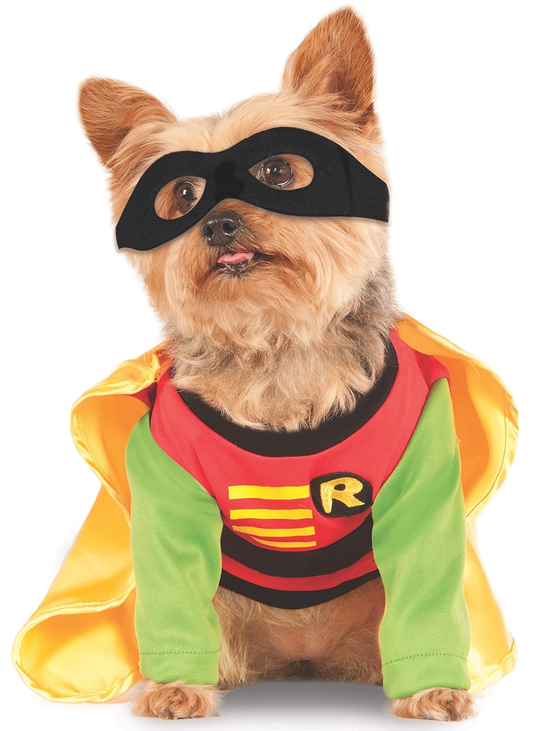 - Teen Titans Robin pet costume features red shirt with green sleeves, detachable cape and eye mask