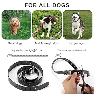 | There are 2 sets of conductive silicone prongs and metal prongs, and conductive silicone prongs are used to protect the pet's coat and skin. When you wear the silicone prongs, push them to the end until the top of the silicone prongs touch the top of the metal prongs to prevent the silicone prongs from falling out. | We suggest using the shock mode in case of emergency and start on the lowest setting then increase gradually until you see a sign that your dog feels it. And never attach a leash to the receiver collar. The dog training collar suitable for all size dogs. PU collar adjustable size is 0-24 inch. |
